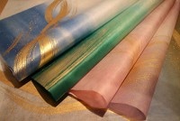 押し花やちぎり絵のバック紙として向く染め和紙です。グラデーションの染めに金か銀の刷毛模様がついています。それぞれ1点ものです。
