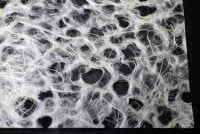 長い繊維を漉き込んだ穴模様の紙です。日本伝統の和紙ではありませんが特長のあるデザインでインテリアなどに人気です。薄く穴部分も多いのですが繊維の効果で丈夫です。